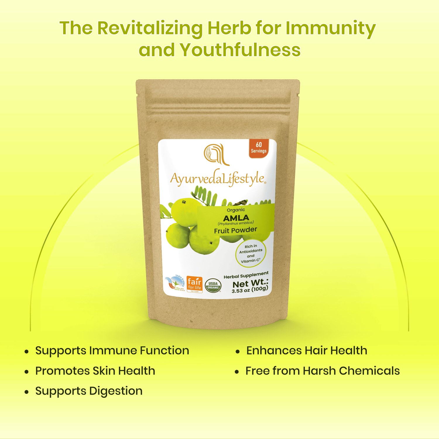 Ayurveda Lifestyle’s Amla Powder is organic, sustainably sourced, and crafted with over 37 years of expertise. It is certified by USDA, and Fair for Life, ensuring the highest quality, purity, and effectiveness, free from harmful chemicals or additives.