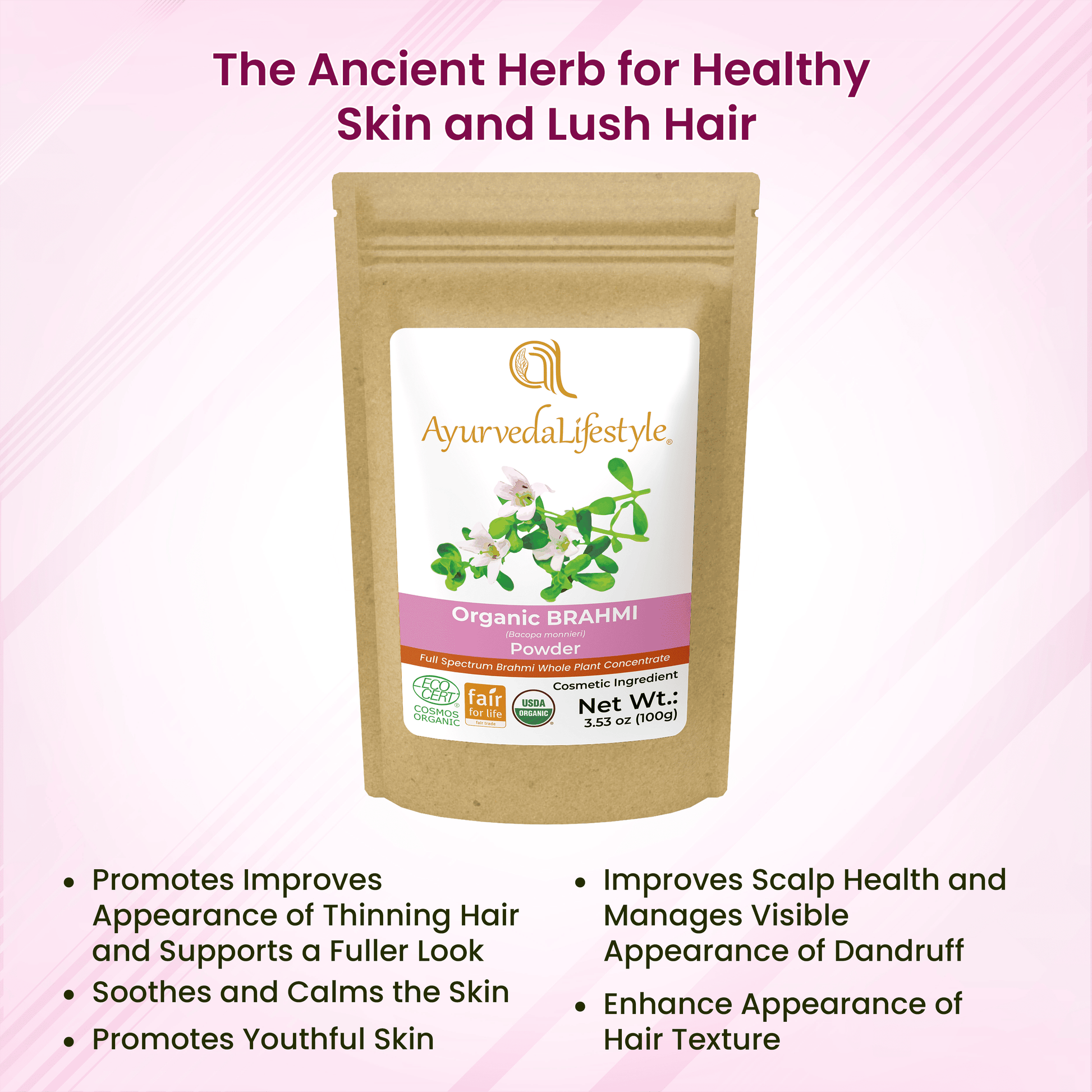 Brahmi Powder naturally promotes hair to appear fuller and thicker. It helps to nourish the scalp, supports hair health, and improves appearance of thinning hair.