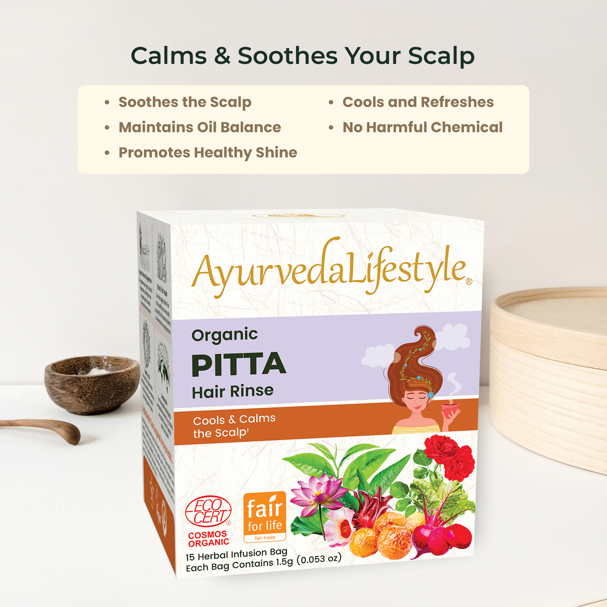 Calms scalp inflammation and promotes peace.