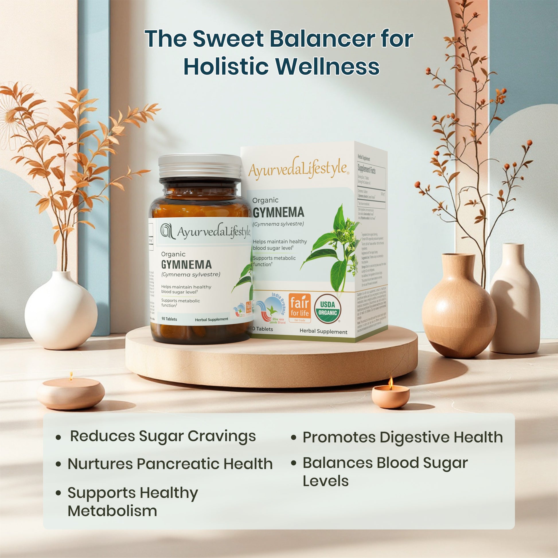 Organic Gymnema, also known as Gudmar or “sugar destroyer” (Gymnema sylvestre), is a revered herb in Ayurveda, known for its remarkable ability to balance blood sugar levels and support metabolic health. This potent herb works by reducing sugar cravings, and promoting a healthy pancreas. At Ayurveda Lifestyle, our Organic Gymnema Tablets are crafted from premium organic leaves, offering you a natural path to balanced blood sugar and improved vitality.
