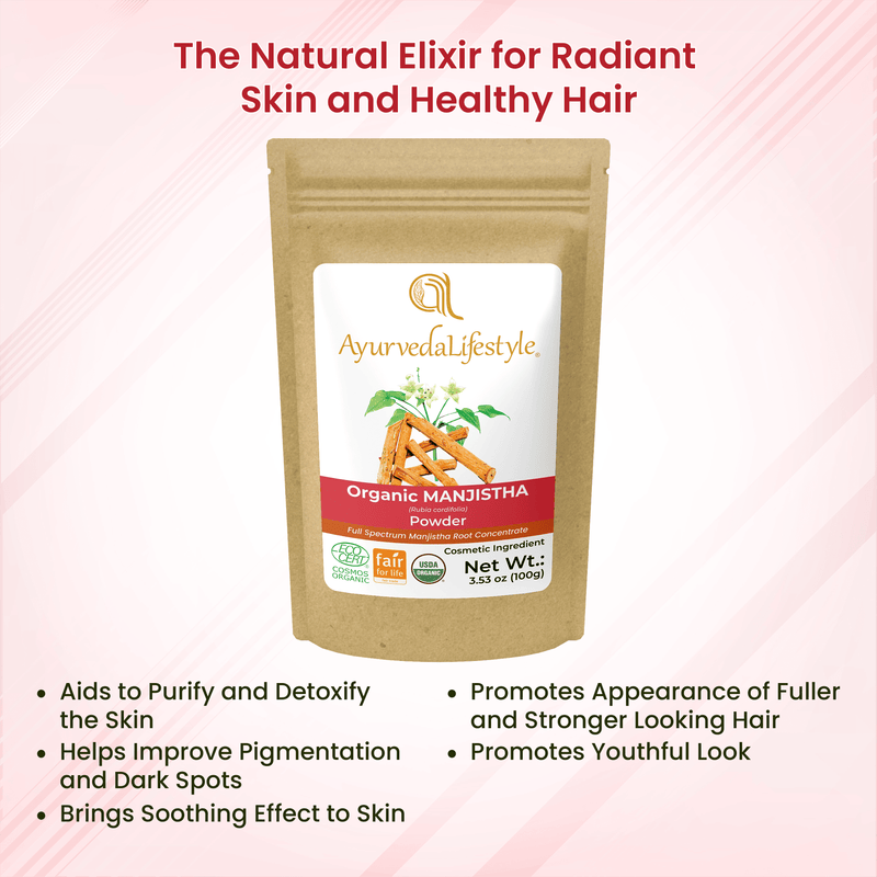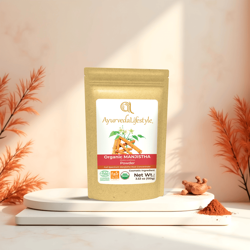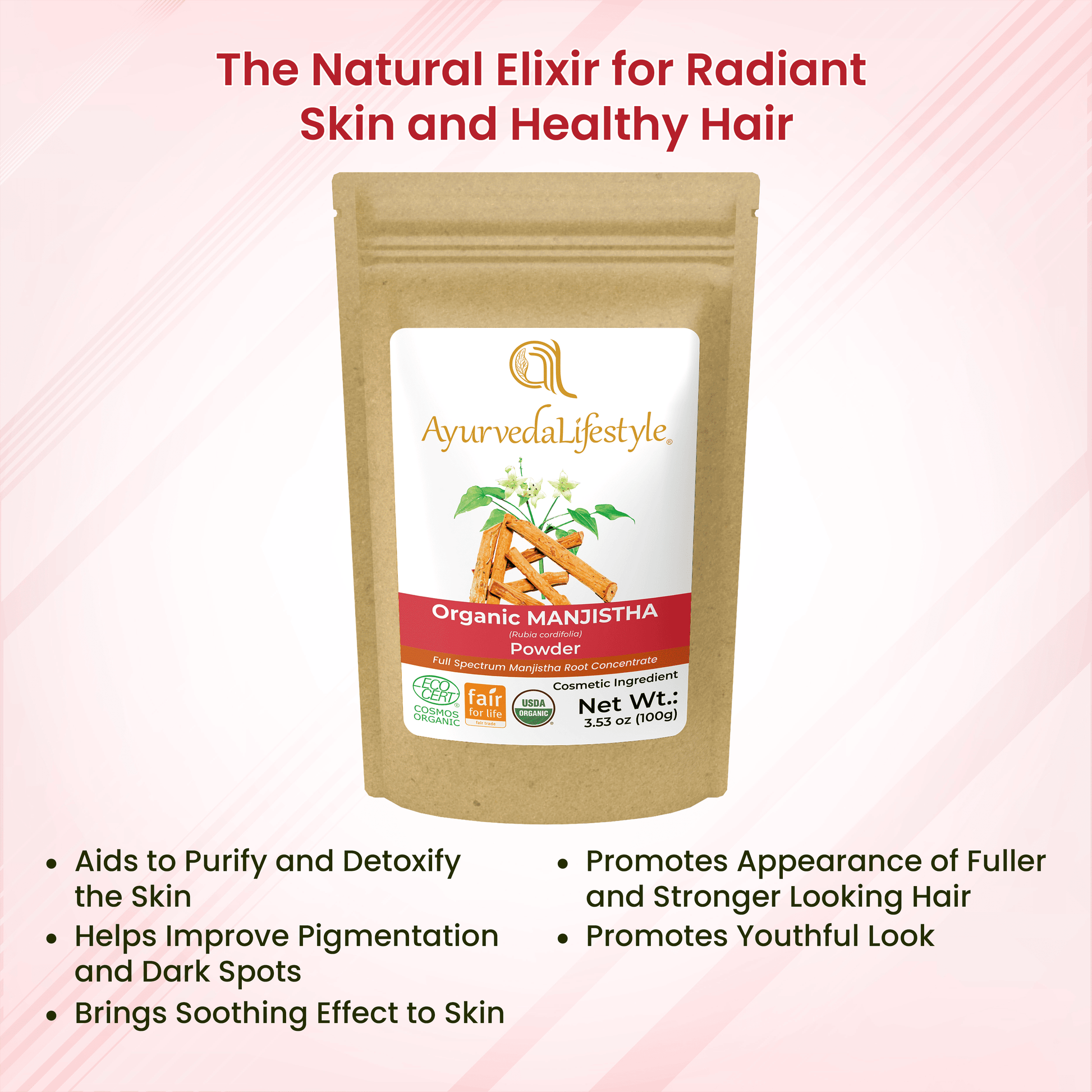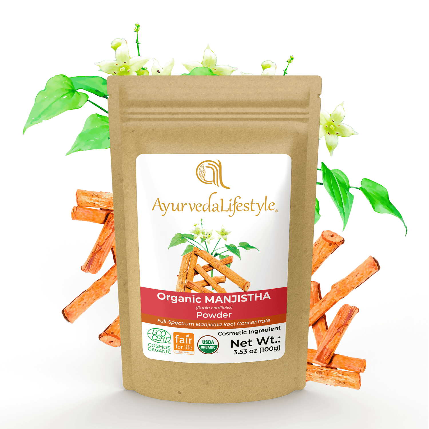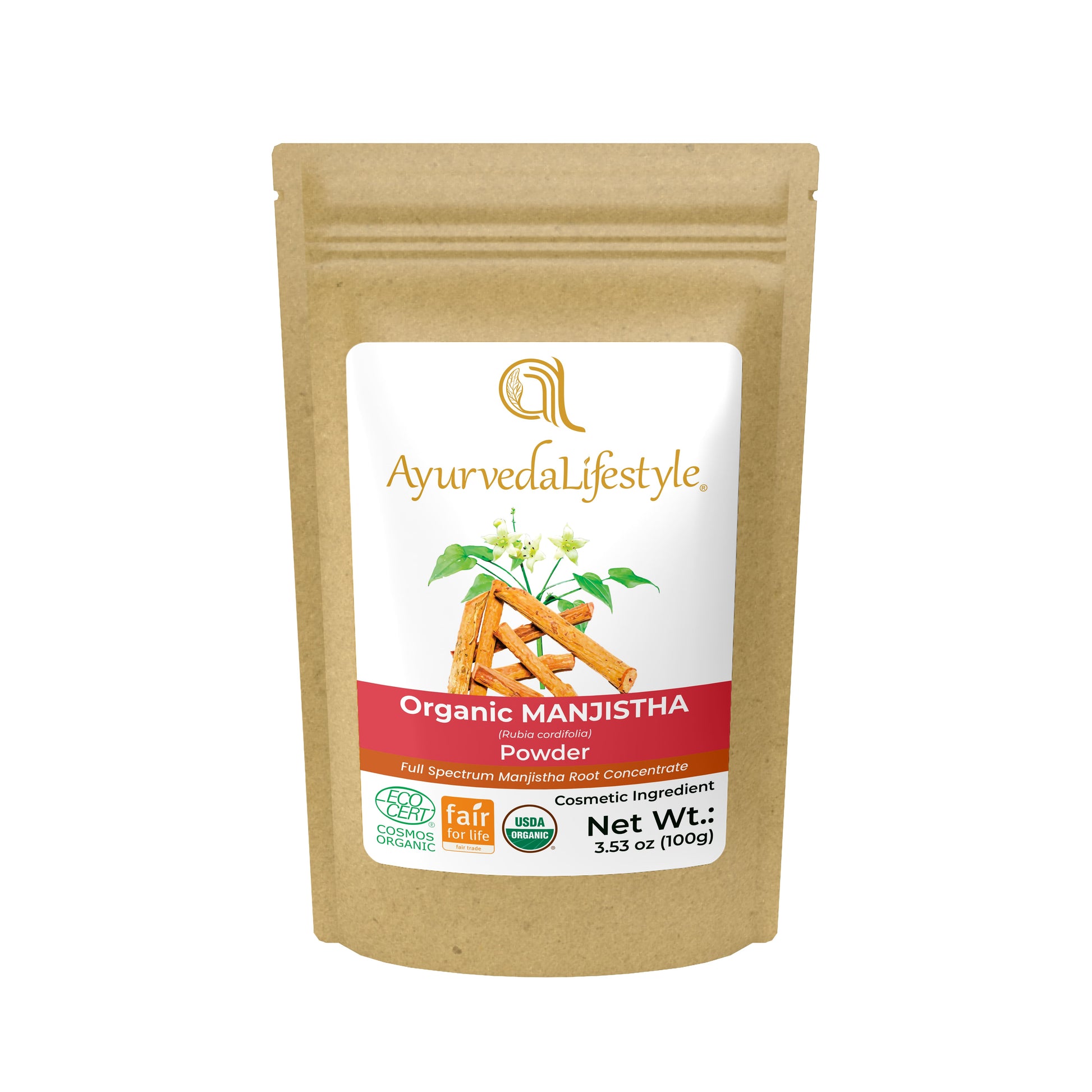 Organic Manjistha Powder, derived from the roots of the Rubia cordifolia plant, is a revered herb in Ayurvedic medicine known for its exceptional ability to purify and rejuvenate both skin and hair. Rich in antioxidants, vitamins, and minerals, this powerful powder has been used for centuries to promote clear, glowing skin and enhance hair health. Manjistha traditionally valued for its detoxifying, anti-inflammatory, and antimicrobial properties, may help support the appearance of a clear complexion and balanced skin tone. When applied to the hair, it helps to nourish the scalp, get a fuller appearance, and add shine to dull, lifeless strands. Whether you seek to enhance your natural beauty or restore skin and hair vitality, Organic Manjistha Powder is a must-have for a holistic beauty regimen.