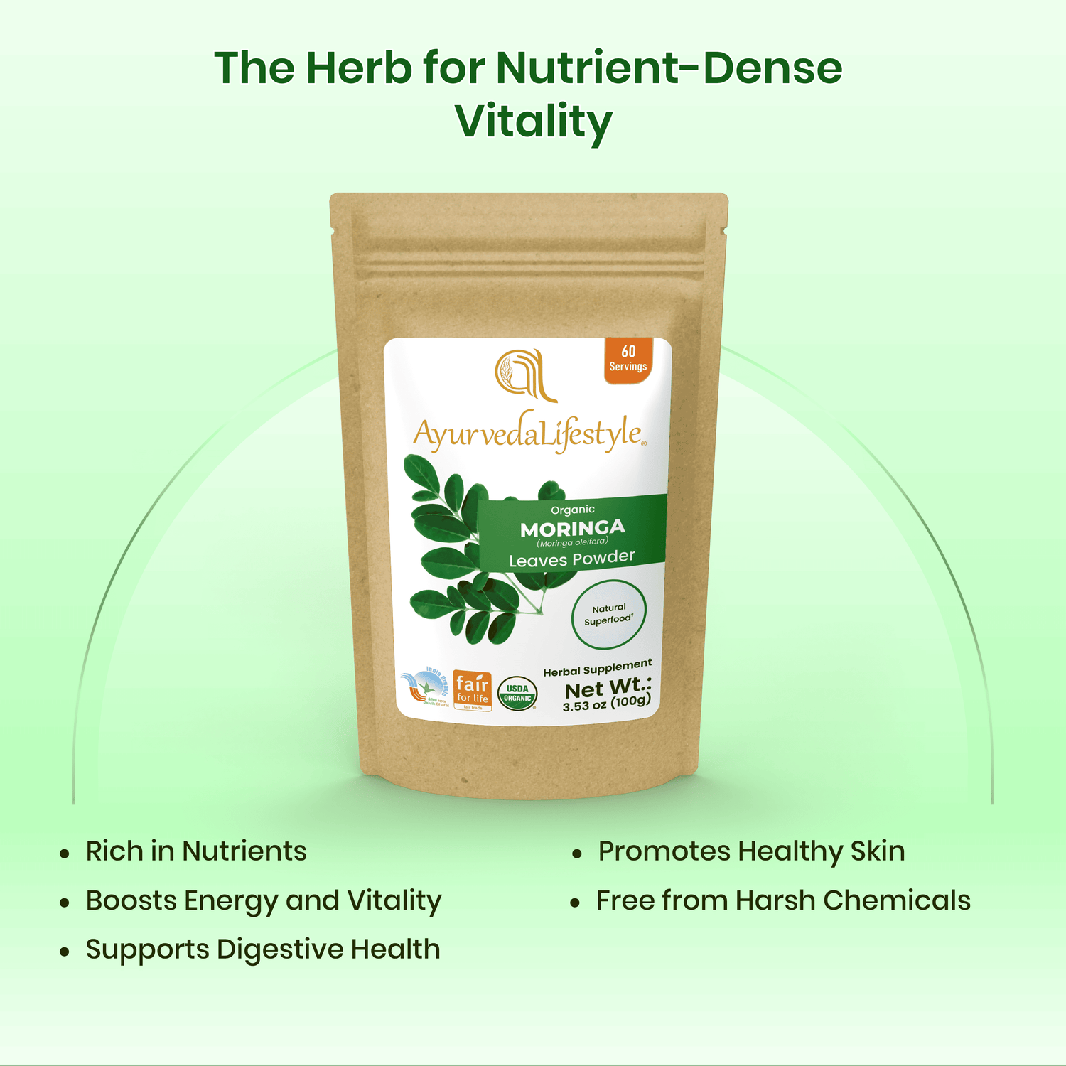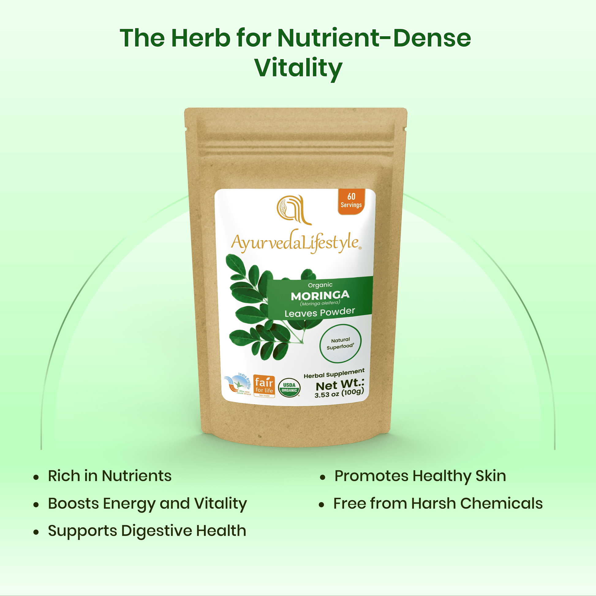 At Ayurveda Lifestyle, our Moringa powder is made from organic Moringa leaves, ensuring the highest quality and purity. Free from harmful chemicals and additives, it offers a natural, nutrient-dense solution for a balanced, healthy lifestyle.