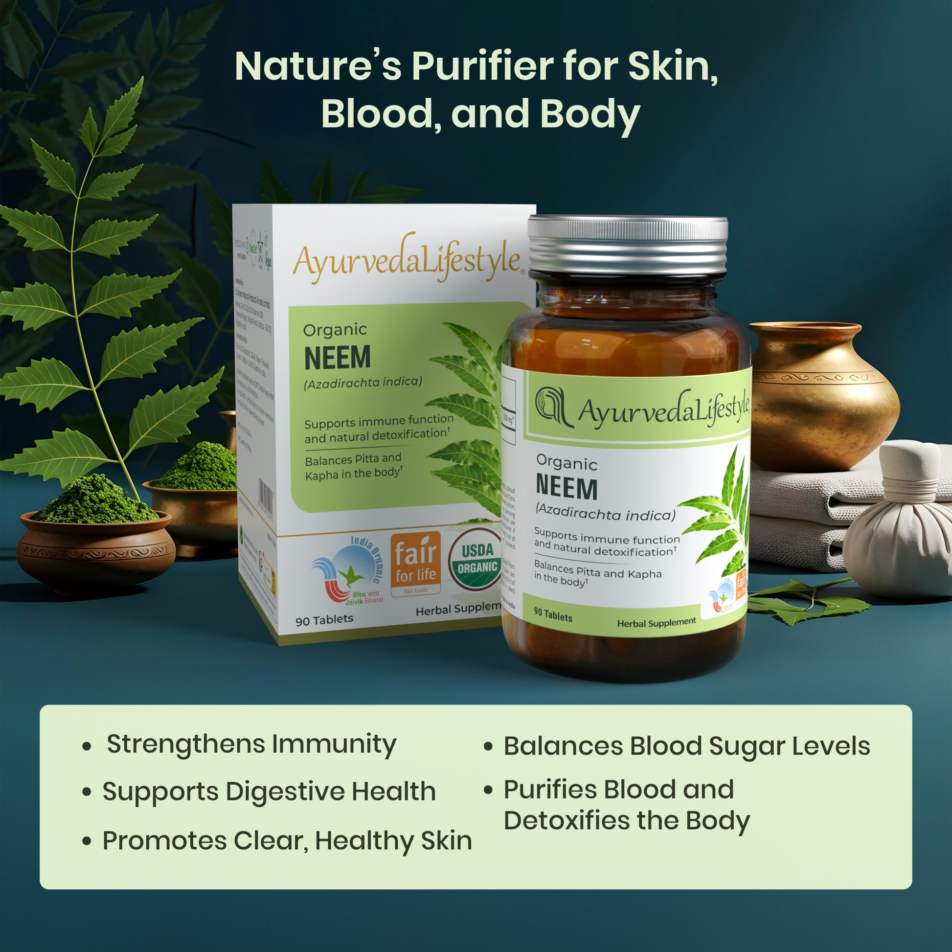 Organic Neem, revered as Nimba in Ayurveda, is celebrated for its potent cleansing and healing properties. Known as the "Village Pharmacy," Neem has been used for centuries to purify the blood, promote clear skin, and support immune health. At Ayurveda Lifestyle, our Organic Neem Tablets are crafted from the finest, organically grown Neem leaves to deliver this potent herb in its purest form. Whether you seek radiant skin, a natural detox, or stronger immunity, Neem is your holistic ally for inner and outer wellness.