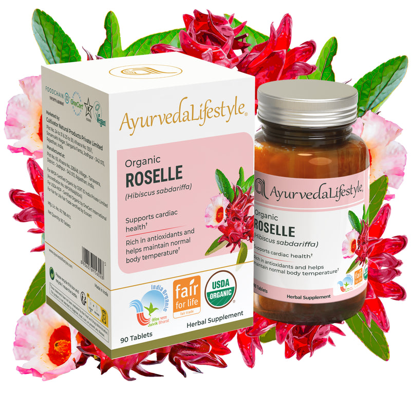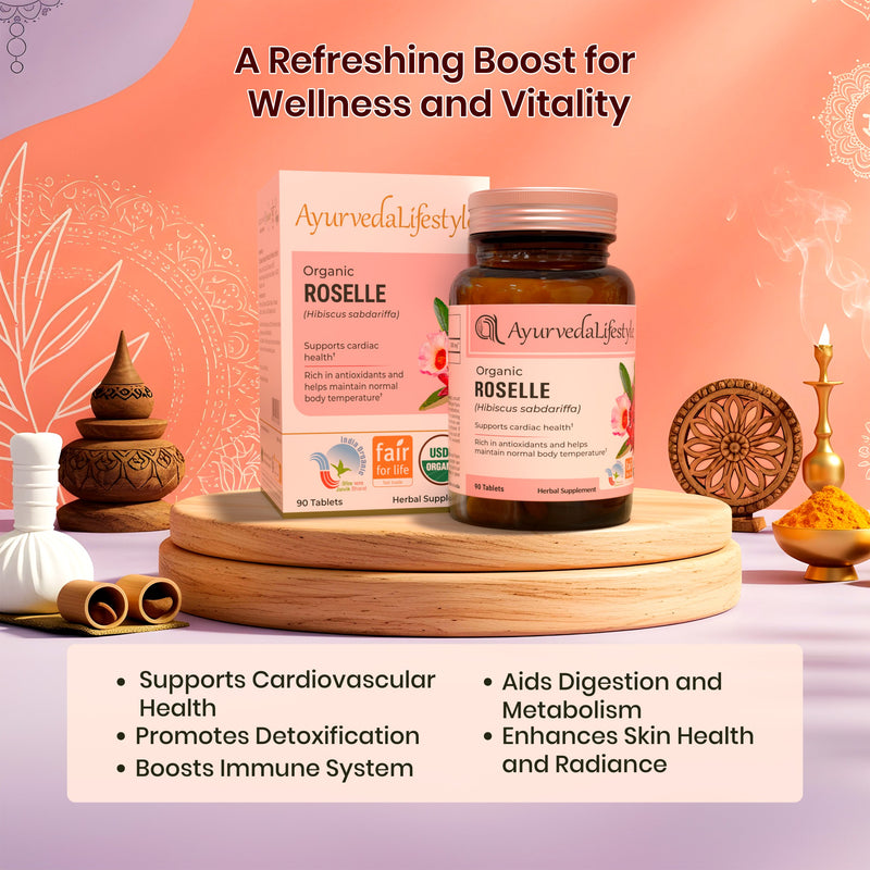 Organic Roselle, also known as Hibiscus Sabdariffa, is a vibrant herb treasured in Ayurveda for its refreshing and rejuvenating properties. At Ayurveda Lifestyle, we bring you Organic Roselle Tablets crafted from organically grown Roselle flowers, offering a natural way to support cardiovascular health, promote detoxification, and enhance vitality. Known for its tangy taste and rich antioxidant profile, Roselle is a natural choice for maintaining overall health and rejuvenation.