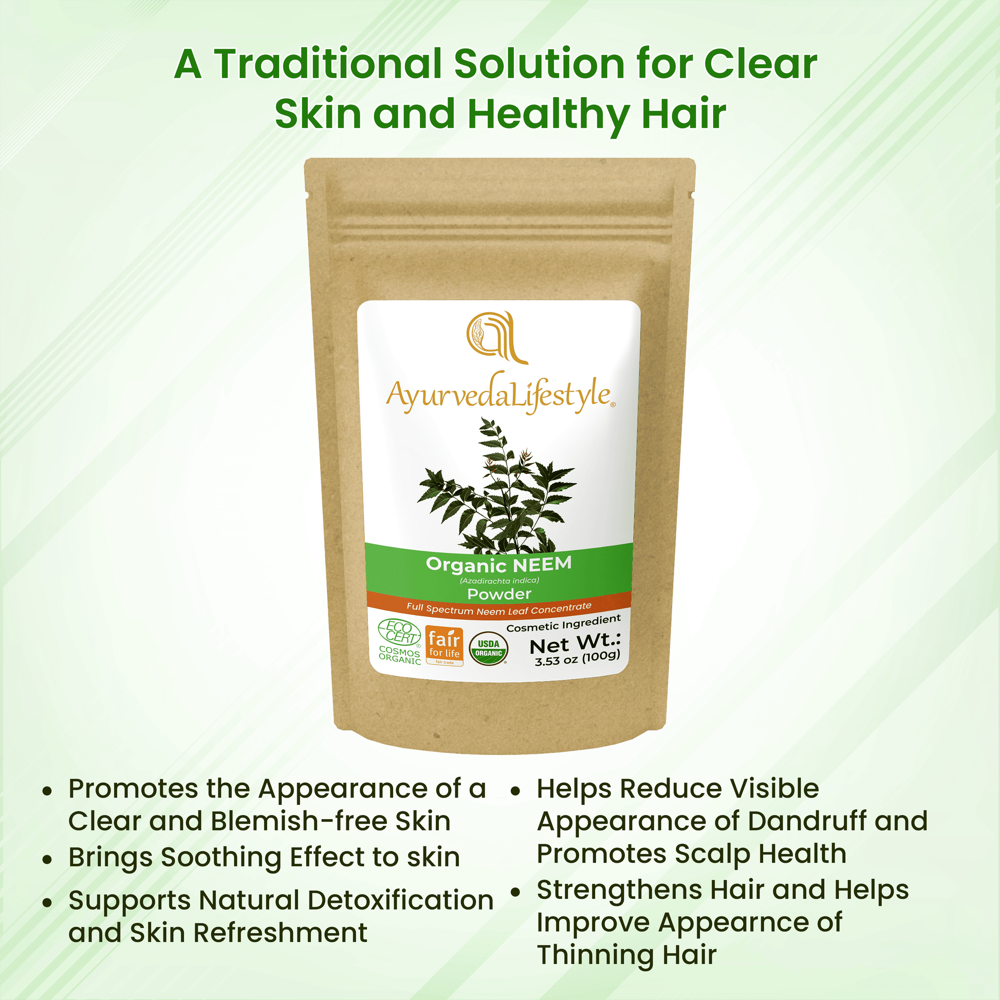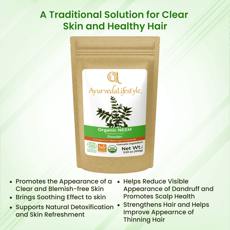 Organic Neem Powder, derived from the leaves of the Azadirachta indica tree, is a potent natural ingredient used for centuries in Ayurvedic medicine for its powerful healing properties. Neem is renowned for its antibacterial, antifungal, and anti-inflammatory benefits, making it an ideal choice for treating skin and hair issues. Whether you're looking to manage visible appearance of dandruff, wish to get a clear and blemish free look, or crave for having a soothing scalp, Organic Neem Powder can help restore balance and promote healthier skin and hair. This versatile powder is a preferred solution for anyone seeking a chemical-free, plant-based solution for natural beauty care.
