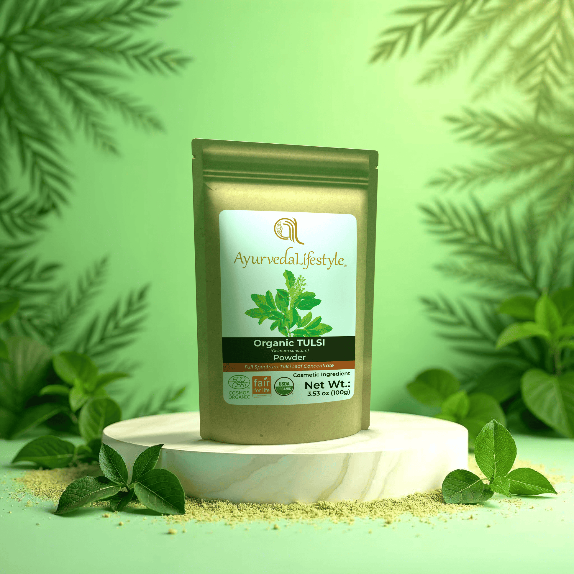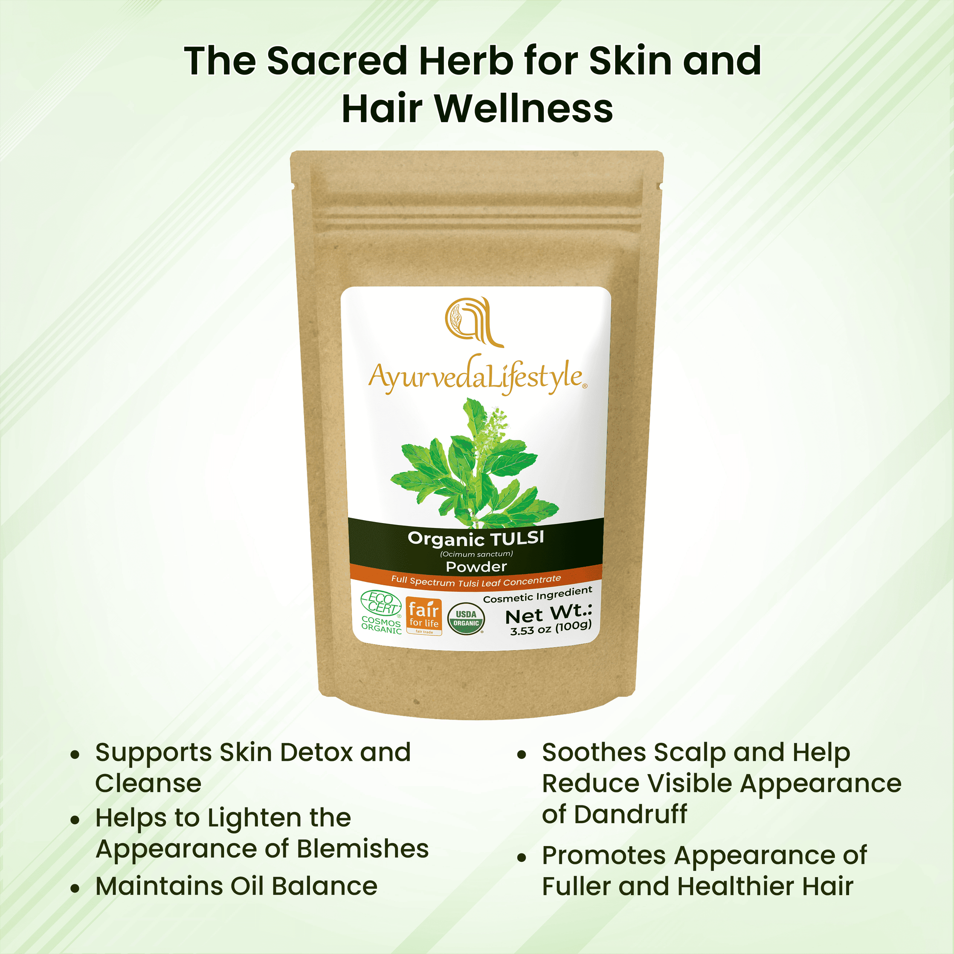 Organic Tulsi Powder, derived from the dried leaves of the Holy Basil (Ocimum sanctum), is a cornerstone of Ayurvedic beauty and wellness rituals. Known as the "Queen of Herbs," Tulsi is rich in antioxidants, antibacterial compounds, and essential nutrients that revitalize the skin and hair. Its purifying nature helps it to reduce visible appearance of dandruff and lighten appearance of blemishes, while its soothing properties brings calming effect and rejuvenate dull hair and skin. Incorporating Organic Tulsi Powder into your routine brings the natural power of Ayurveda to your beauty regimen.